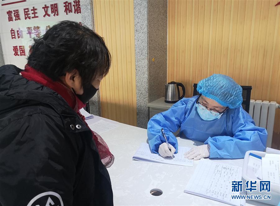 医务人员在阳曲县人民医院门诊入口处预检分诊(3月3日摄)。 新华社记者 马晓媛 摄