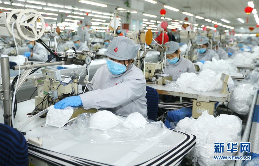 山东省青岛市一家纺织企业的工人在车间内制作口罩(2月12日摄)。 新华社发(梁孝鹏 摄)