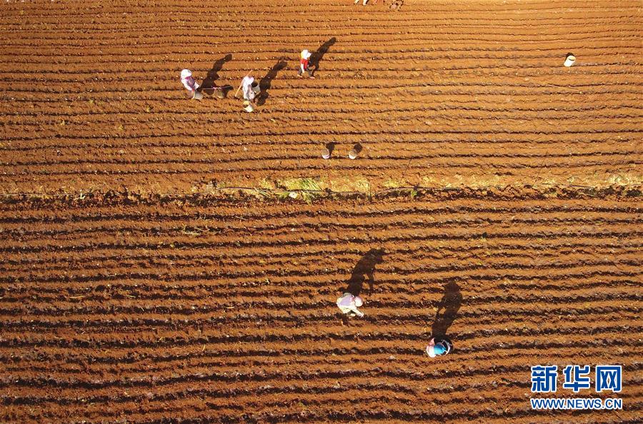 3月6日,云南省曲靖市沾益区花山街道施家屯村的农民在地里播种经济作物(无人机照片)。近日,云南省曲靖市沾益区花山街道田间,当地农民抢抓农时,积极开展春耕生产。 新华社记者杨宗友摄