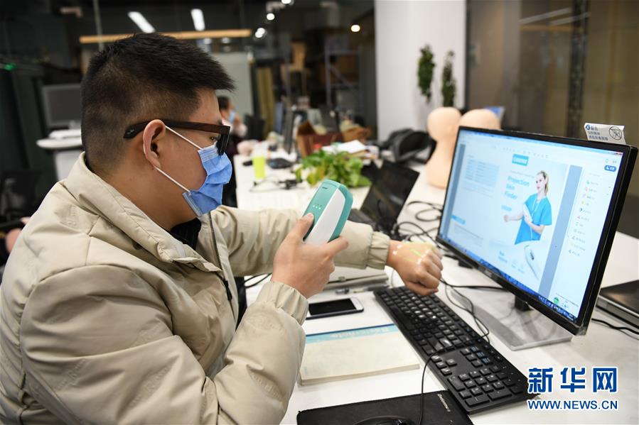 3月6日,在西安中科微光影像技术有限公司,工作人员对投影式红外血管成像仪进行调试检测。新华社记者 李一博 摄