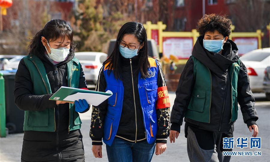 3月5日,在内蒙古呼和浩特市清泉街社区,社区网格员查看小区疫情防控值守情况。 新华社记者 连振 摄