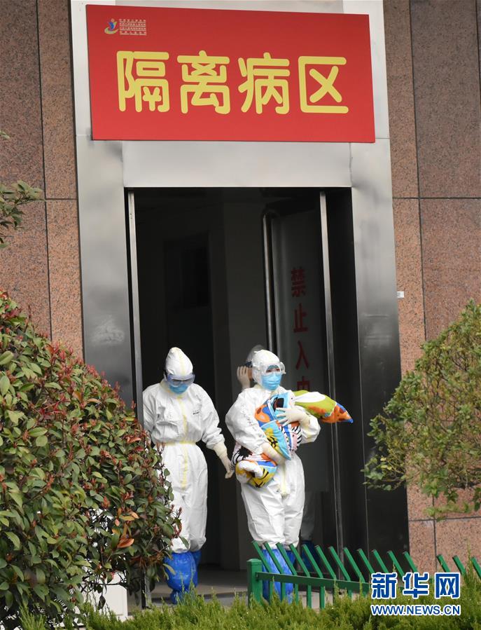 3月6日,河南省儿童医院医护人员抱着治愈的宝宝。 在医护人员精心治疗护理下,出生5天即被确诊感染新冠肺炎的河南信阳宝宝当日从河南省儿童医院治愈出院。 新华社记者 张浩然 摄