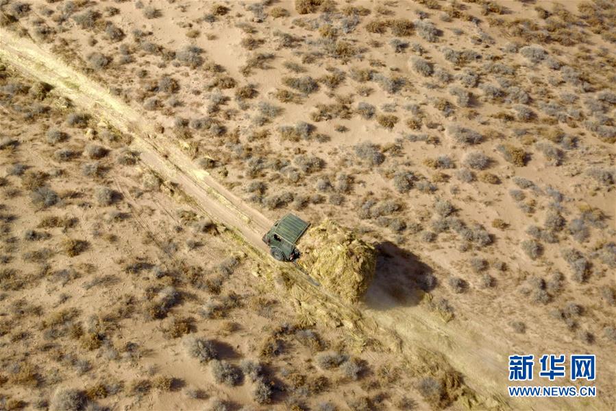 3月6日,在古浪县北部沙区旱麻岗治沙点,卡车转运压沙用的稻草(无人机照片)。 近日,甘肃省武威市古浪县八步沙林场治沙人和当地群众共同在腾格里沙漠南缘开展压沙造林。他们计划2020年春季压沙造林7000亩。 2019年3月,中宣部授予甘肃省武威市古浪县八步沙林场“六老汉”三代人治沙造林先进群体“时代楷模”称号。如今,“六老汉”的子孙们传承老一辈治沙精神,坚守八步沙林场,继续保卫家园斗风沙。 新华社记者 范培珅 摄
