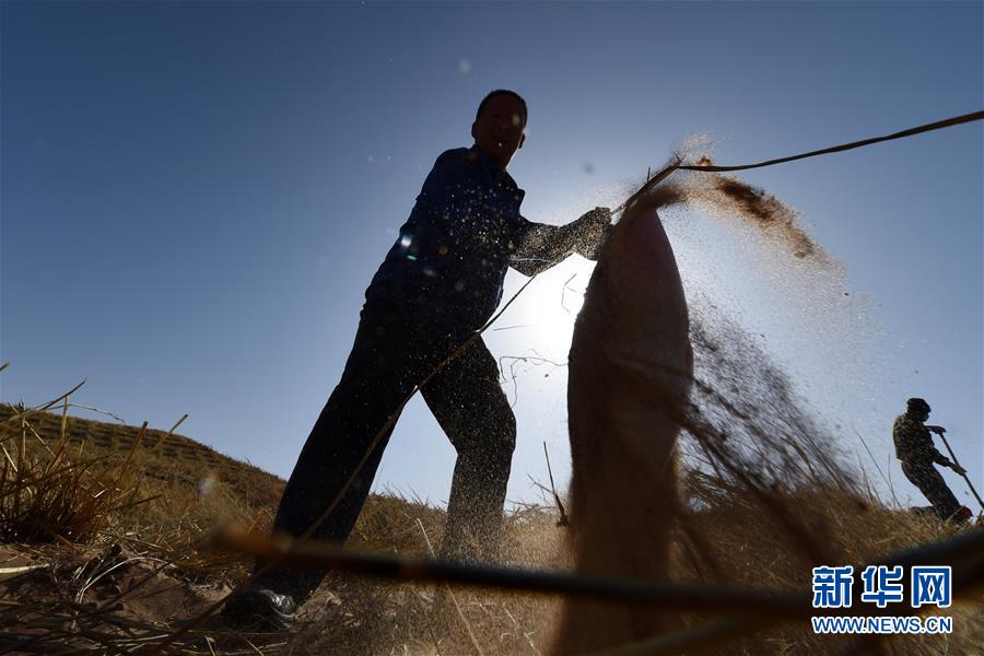 3月6日,在古浪县北部沙区旱麻岗治沙点,八步沙林场第二代治沙人石银山扎草方格压沙。 近日,甘肃省武威市古浪县八步沙林场治沙人和当地群众共同在腾格里沙漠南缘开展压沙造林。他们计划2020年春季压沙造林7000亩。 2019年3月,中宣部授予甘肃省武威市古浪县八步沙林场“六老汉”三代人治沙造林先进群体“时代楷模”称号。如今,“六老汉”的子孙们传承老一辈治沙精神,坚守八步沙林场,继续保卫家园斗风沙。 新华社记者 范培珅 摄