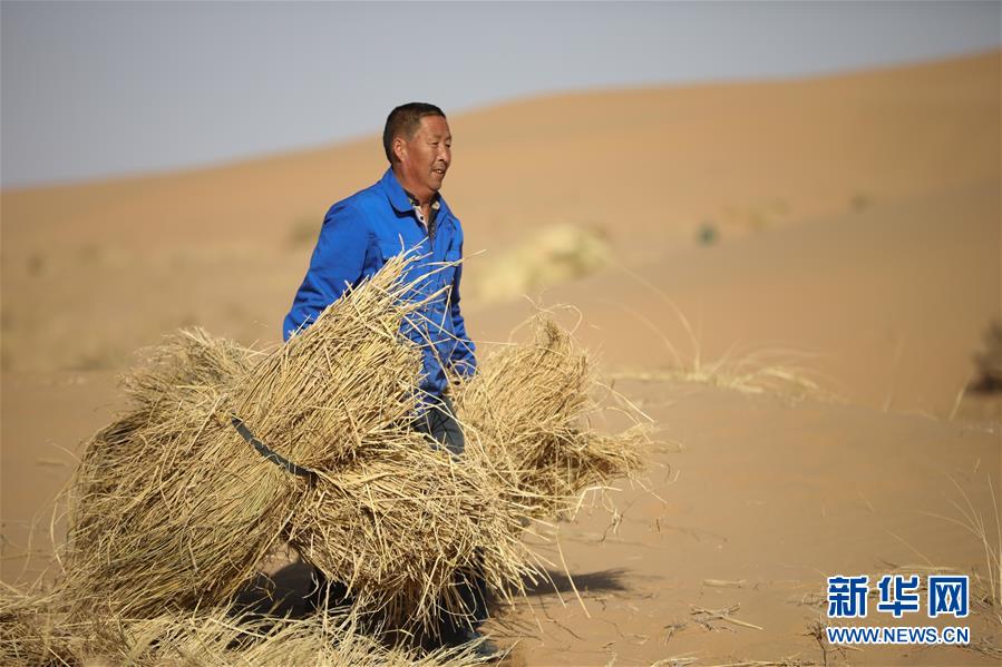 3月6日,在古浪县北部沙区旱麻岗治沙点,八步沙林场第二代治沙人石银山搬运稻草。 近日,甘肃省武威市古浪县八步沙林场治沙人和当地群众共同在腾格里沙漠南缘开展压沙造林。他们计划2020年春季压沙造林7000亩。 2019年3月,中宣部授予甘肃省武威市古浪县八步沙林场“六老汉”三代人治沙造林先进群体“时代楷模”称号。如今,“六老汉”的子孙们传承老一辈治沙精神,坚守八步沙林场,继续保卫家园斗风沙。 新华社发(马希平 摄)