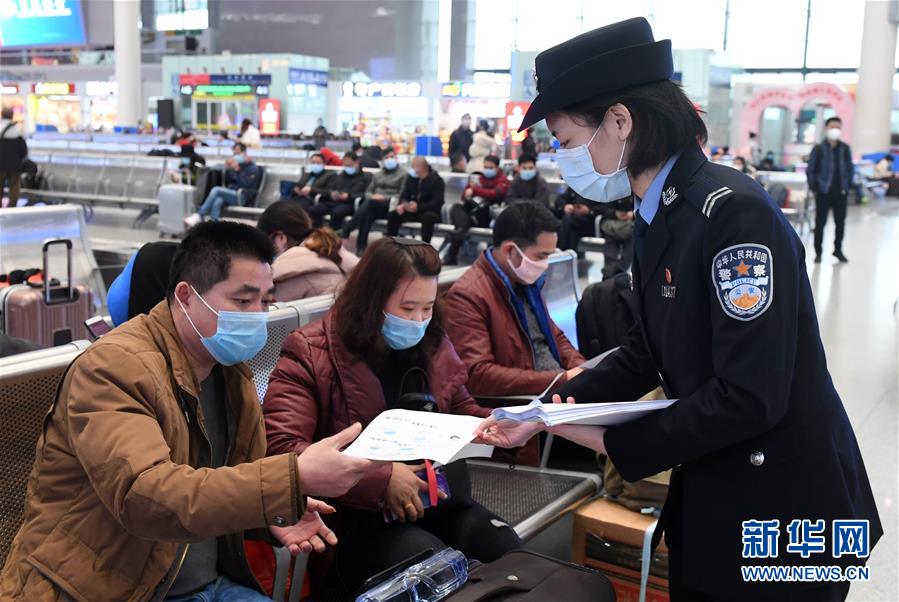 在广西南宁东站,南宁铁路公安处女民警花子惠(右一)将自己创作的疫情防控宣传漫画送给乘客(2月4日摄)。 自新冠肺炎疫情出现以来,她们一直在坚守,用自己的方式为疫情防控工作贡献力量。 新华社记者 陆波岸 摄