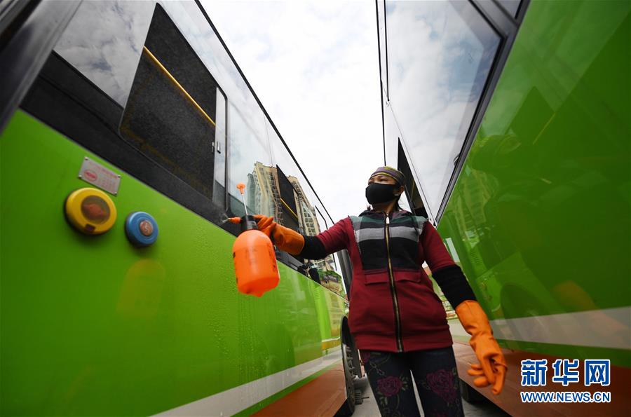 在广西南宁公共交通集团有限公司营运一分公司五一车队,一名女工作人员在对公交车进行消毒(2月18日摄)。 自新冠肺炎疫情出现以来,她们一直在坚守,用自己的方式为疫情防控工作贡献力量。 新华社记者 陆波岸 摄