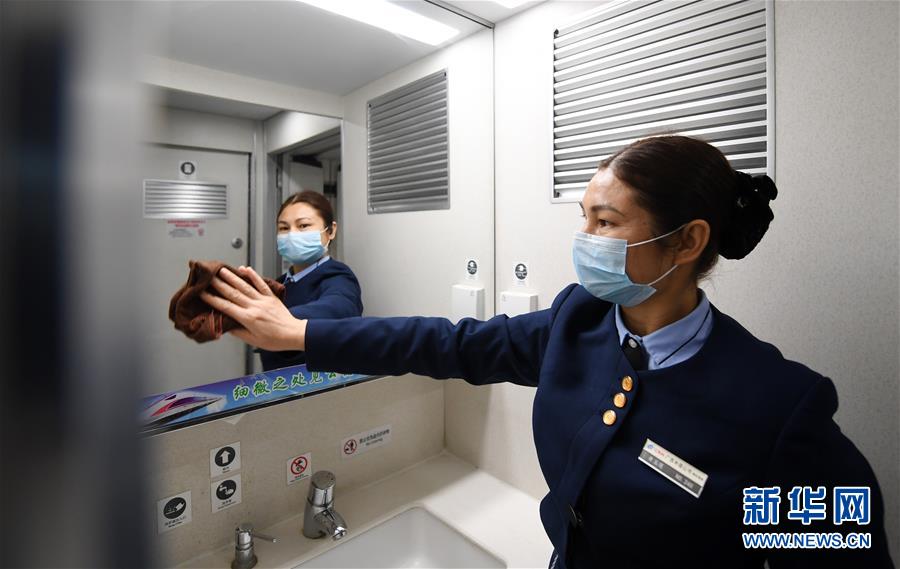 在广西百色市开往南宁市的动车上,一名女工作人员在对车辆内部进行保洁(2月19日摄)。 自新冠肺炎疫情出现以来,她们一直在坚守,用自己的方式为疫情防控工作贡献力量。 新华社记者 陆波岸 摄