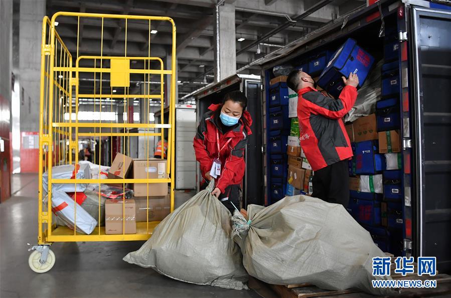 中午出发送货前,梁红娟与同事一起装运货物(3月6日摄)。 新华社记者 刘潇 摄