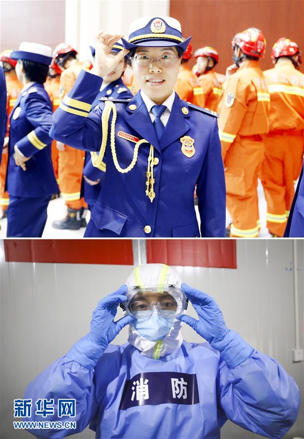 拼版照片:上图为2018年12月26日拍摄的身着“火焰蓝”消防制服的刘艳红 (新华社发 王方 摄);下图为2020年3月7日拍摄的身着“天使蓝”防护服的刘艳红(新华社记者 肖艺九 摄)。 刘艳红是武汉市消防救援支队一名女消防监督员,新冠肺炎疫情发生后,她被派到武汉长江新城康复驿站隔离点,具体负责现场的室内消火栓、灭火器等消防器材设施检查,以及医护人员以及康复隔离人员消防技术指导服务。她说,“事情不论大小、岗位不论轻重,只要是对疫情期间火灾防控工作有益的,都是分内之事。” 新华社发