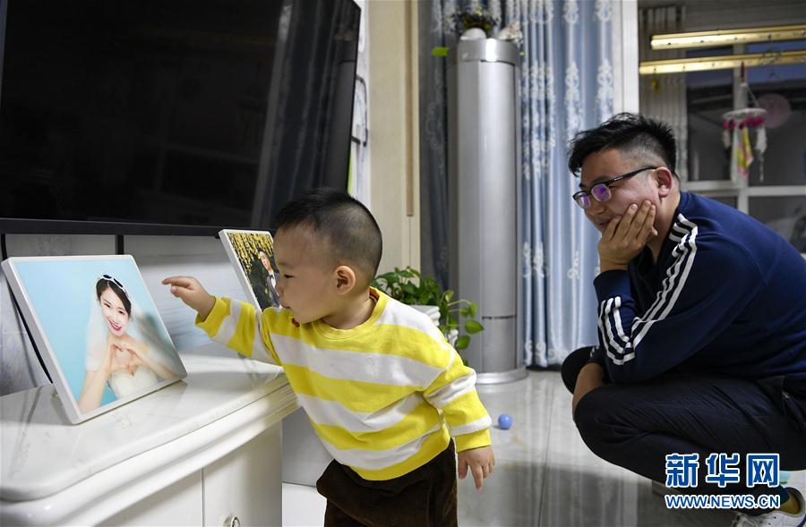余东在家中陪儿子“小树苗”玩耍,刚开始咿呀学语的“小树苗”指着照片里的朱谊喊“妈妈”(3月4日摄)。
