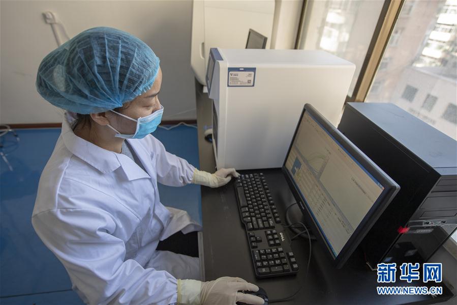 3月3日,张慧变在吕梁市疾控中心的产物分析区内进行上机检测。 新华社记者 杨晨光摄