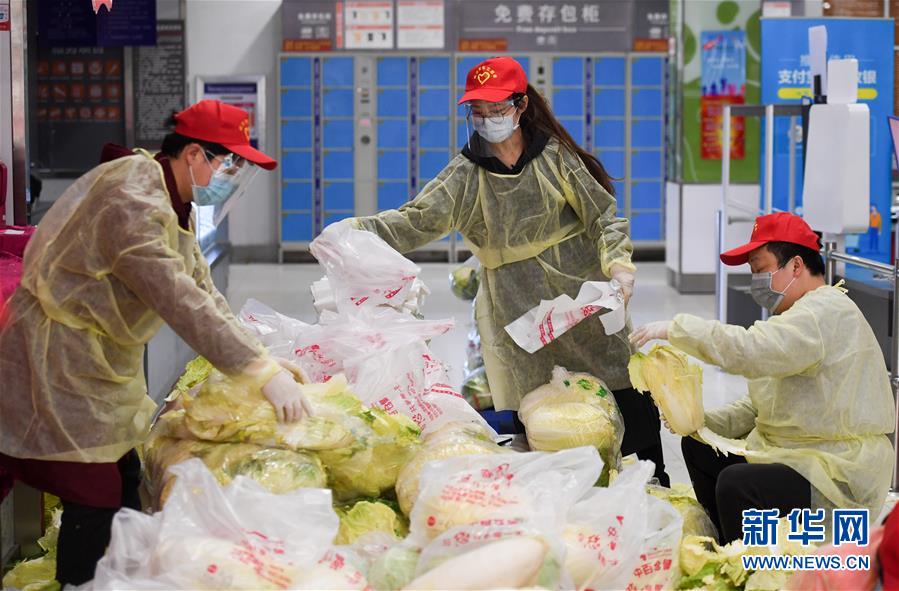 3月7日,郑欣怡(中)在武汉中百仓储百步亭花园路店分塑料袋。新华社记者陈晔华摄