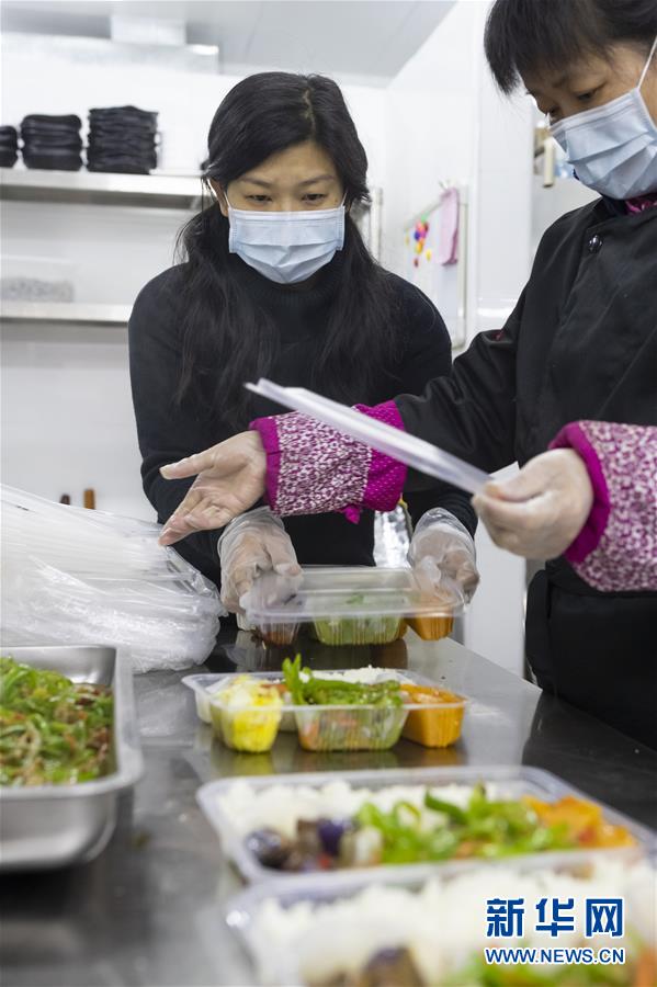 3月7日,肖晶(左)与舅妈一起分装盒饭。