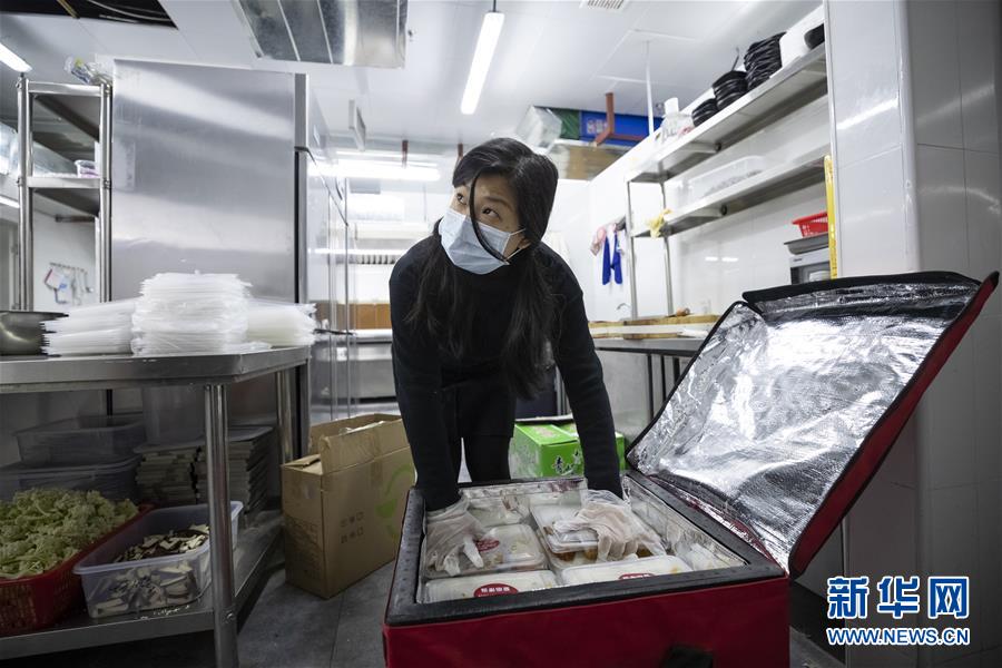 3月7日,肖晶将分装好的盒饭装入消过毒的送餐保温箱。新华社记者 沈伯韩 摄