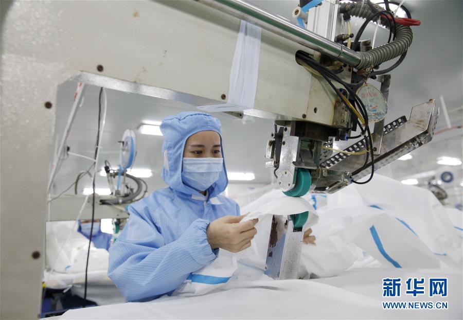 在江苏省宿迁市泗阳县经济开发区的稳德福无纺科技有限公司,工人在生产医用防护服(2月21日摄)。新华社发(郑明高 摄)
