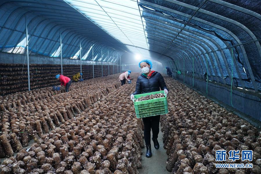 3月8日,河北省临城县赵庄乡店上村农民在香菇种植棚搬运刚刚采收的香菇。 新华社记者 牟宇 摄