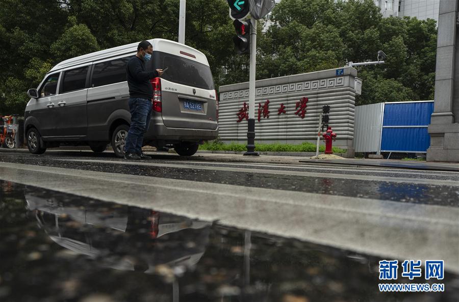 3月7日,武汉送菜员马增辰在武汉大学门口联系客户出来取货。 新华社记者费茂华摄