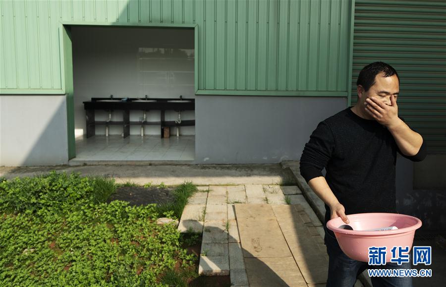 3月7日,武汉送菜员马增辰在公司仓库的厕所里洗漱。 新华社记者费茂华摄
