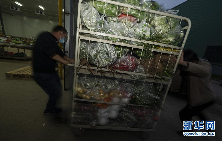 3月7日清晨,武汉送菜员马增辰(左)在同事的帮助下,把一个装满蔬菜的推车推上小坡。 新华社记者费茂华摄