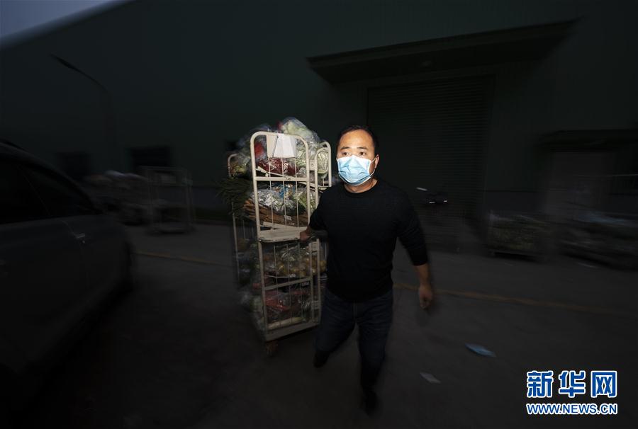 3月7日清晨,武汉送菜员马增辰拉着自己当天需要送的货品准备装车。 新华社记者费茂华摄