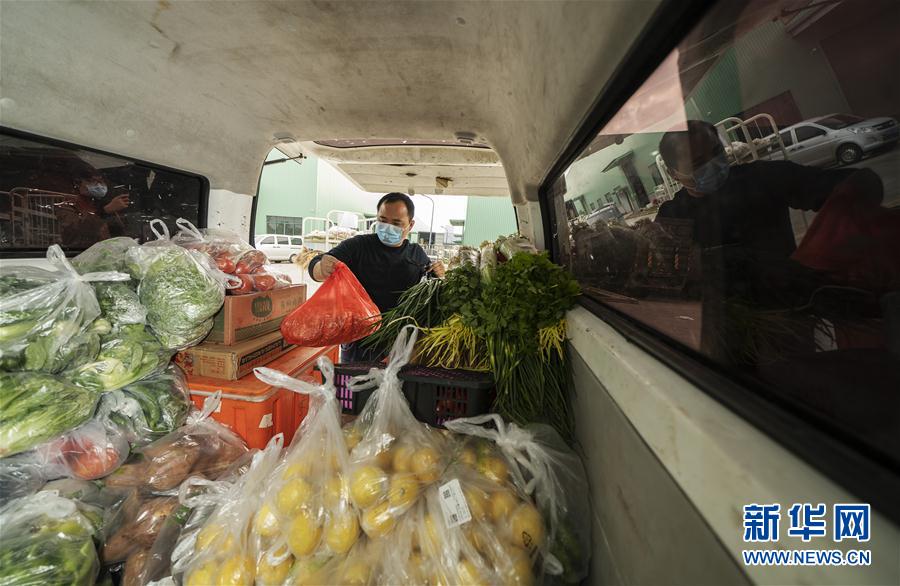 3月7日,武汉送菜员马增辰将自己当天需要送的货品装车。 新华社记者费茂华摄