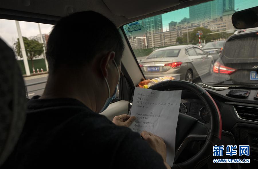 3月7日,武汉送菜员马增辰趁等红灯的时间,再次核对自己的送货信息。 新华社记者费茂华摄