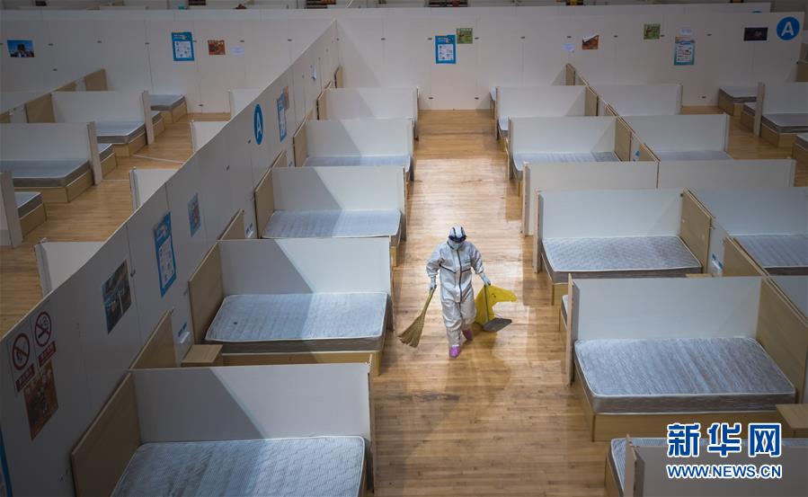 3月8日,工作人员在舱内进行清理作业。 当日,武汉体育中心方舱医院送走最后一批痊愈患者,正式休舱。随后,舱内将进行全面消毒工作。 新华社记者 肖艺九 摄