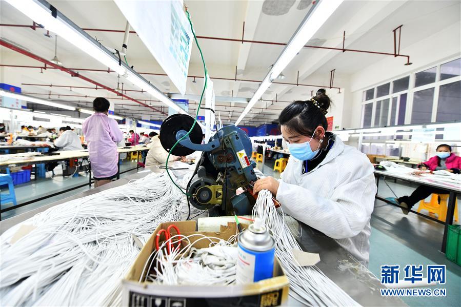 在贵州省遵义市务川县一家电子制造企业,工人在生产手机耳机配件(2月29日摄)。 新华社记者 杨文斌 摄