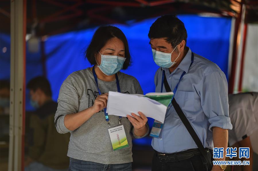 3月8日,在海口市秀英区一处医学集中隔离观察点外的工作帐篷里,心理疏导工作者曹琼(左)向其他工作人员转达留观人员需求。 近日,记者探访了海南省海口市多处医学集中隔离观察点的心理疏导工作者。他们是海口市卫健委抽调的心理咨询师和心理健康工作者,在各医学集中隔离观察点驻点值班,为留观人员、医护人员等提供心理健康服务,开展必要的心理干预。此外,心理疏导工作者还积极与留观人员和观察点其他工作人员沟通,促进双方相互理解和相关问题解决,助力疫情防控。 新华社发(蒲晓旭 摄)