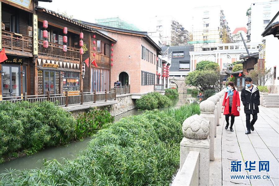 3月5日,游客从福州上下杭历史文化街区的三捷河旁走过。 新华社记者林善传摄
