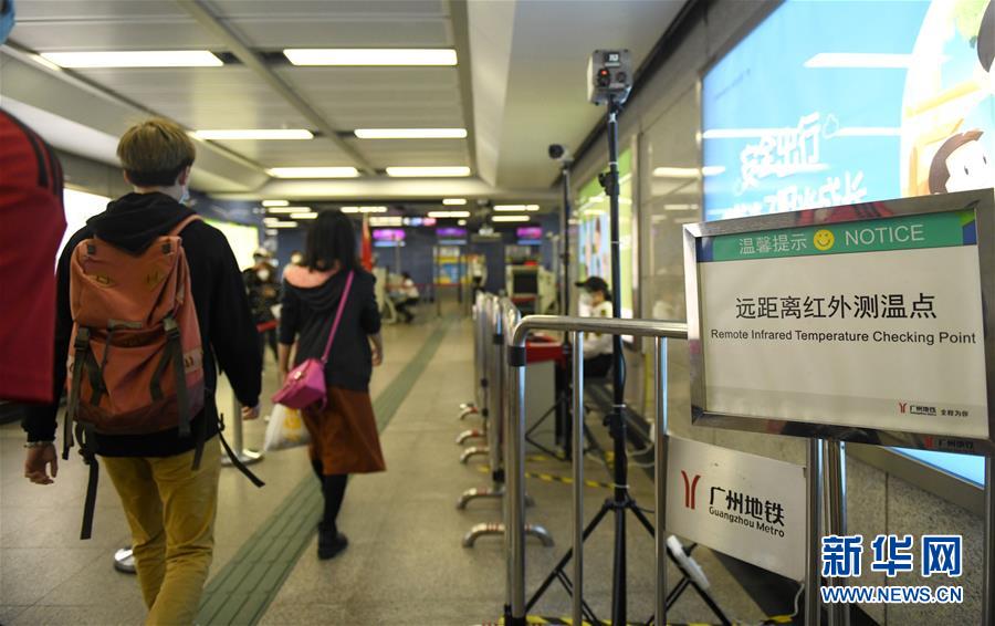 3月9日,在广州地铁海珠广场站,乘客经过红外线体温仪检测后进站。 新华社记者卢汉欣摄