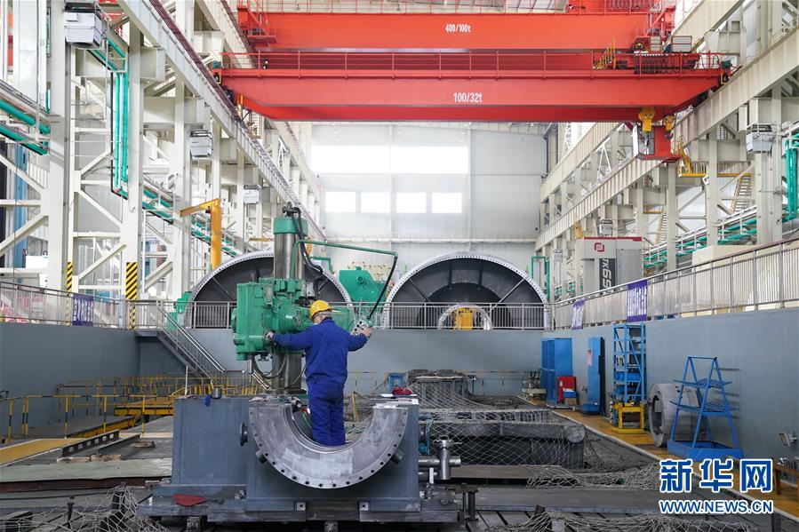 3月9日,在哈电汽轮机生产车间,工人进行生产作业。新华社记者 王建威 摄