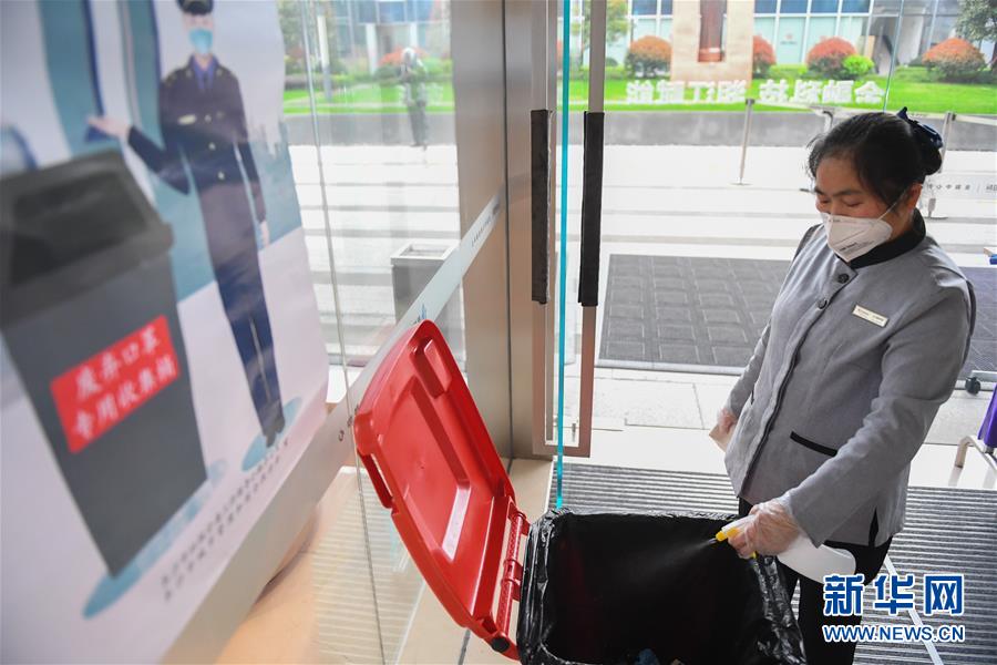 3月9日,在长沙市岳麓区楷林国际大厦,工作人员对废弃口罩专用收集箱进行消毒。 连日来,长沙市岳麓区在加强新冠肺炎疫情防控的同时,推进楼宇企业复工复产。截至目前,该区域内22大重点楼宇全部复工,1471家楼宇企业开启办公模式。 新华社记者 陈泽国 摄