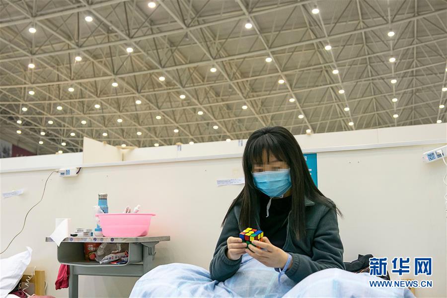 2月10日,向女士在武汉客厅方舱医院玩魔方。 新华社发