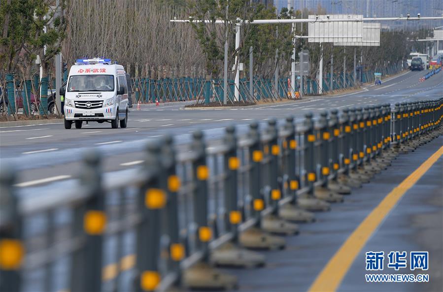 李华驾驶急救转运车奔忙在武汉雷神山医院周边的道路上(2月19日摄)。 新华社记者李贺摄