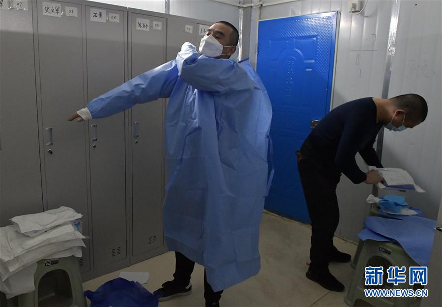 李华(左)和同事在雷神山医院换衣间穿防护服(3月7日摄)。 新华社记者李贺摄