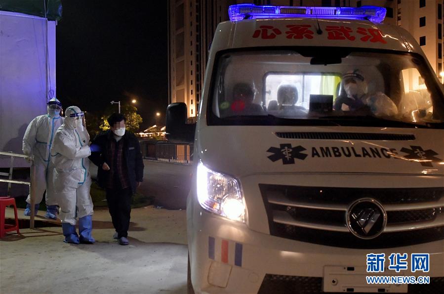 在医护人员的搀扶下,一名病人走出雷神山医院病房准备登上李华驾驶的急救车去武汉中南医院做检查(3月7日摄)。 新华社记者李贺摄