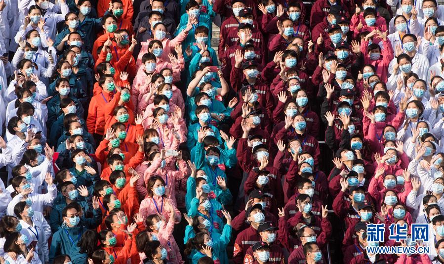 3月10日,医护人员在武昌方舱医院前挥手庆祝。新华社记者 肖艺九 摄