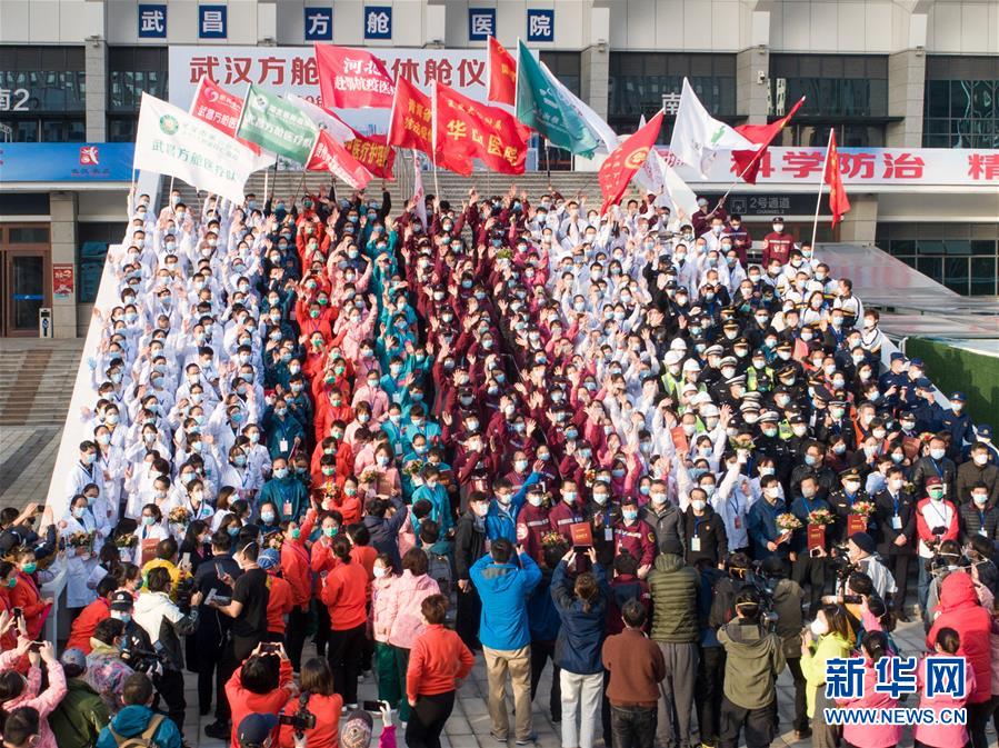 3月10日,医护人员在武昌方舱医院前庆祝(无人机照片)。新华社记者 肖艺九 摄