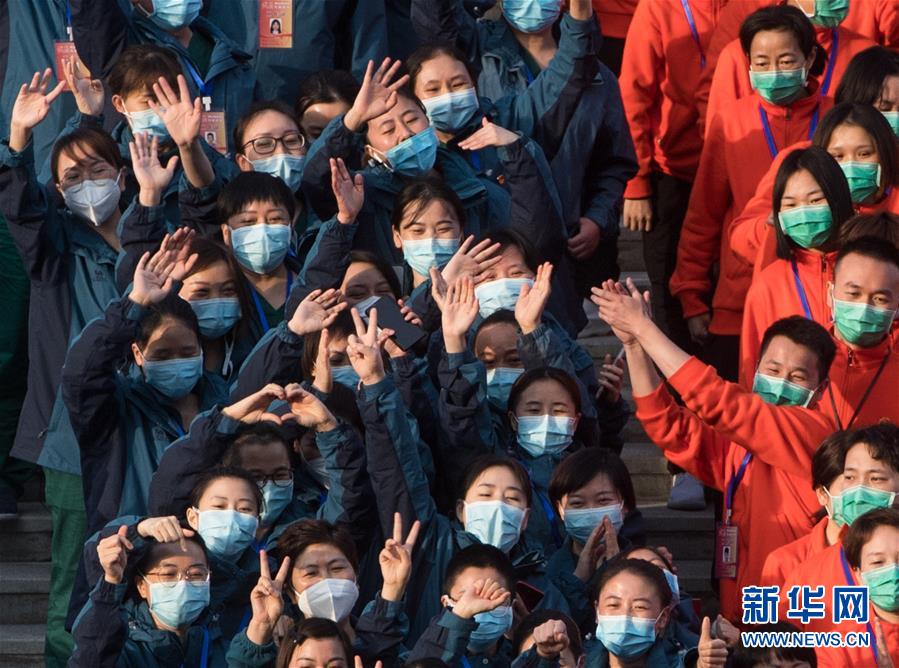 3月10日,医护人员在武昌方舱医院前庆祝。新华社记者 肖艺九 摄