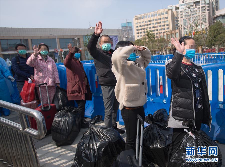 3月10日,痊愈患者出舱后向医护人员挥手致意。 当日,武汉武昌方舱医院正式休舱,医护人员护送最后49名痊愈患者出舱。 新华社记者 肖艺九 摄