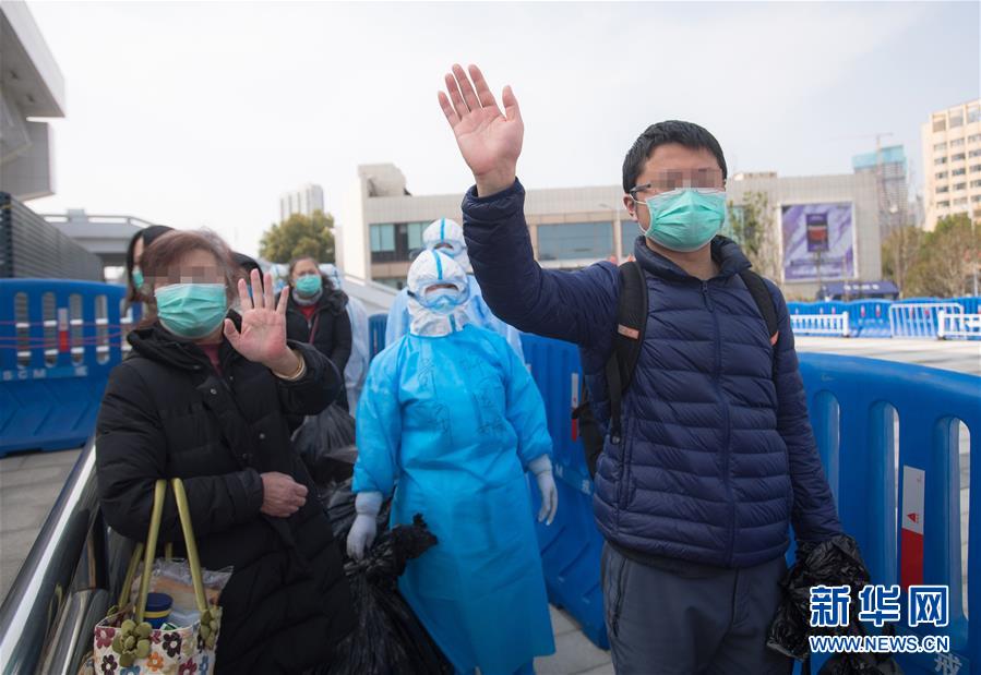 3月10日,痊愈患者出舱后向医护人员挥手致意。 当日,武汉武昌方舱医院正式休舱,医护人员护送最后49名痊愈患者出舱。 新华社记者 肖艺九 摄