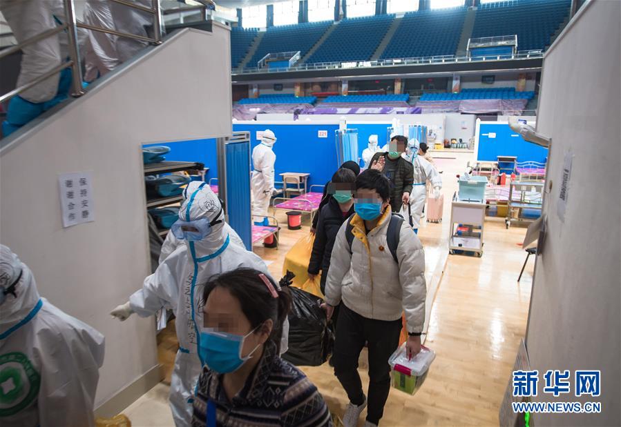 3月10日,医护人员护送痊愈患者出舱。 当日,武汉武昌方舱医院正式休舱,医护人员护送最后49名痊愈患者出舱。 新华社记者 肖艺九 摄