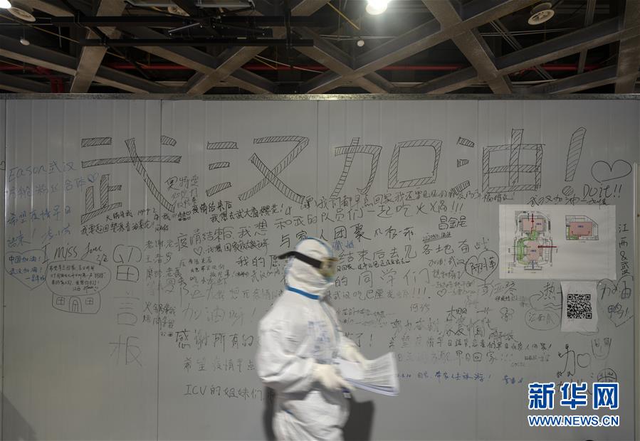 3月10日,在武昌方舱医院,一位医护人员从留言板前走过。 当日,武昌方舱医院最后一批痊愈病人共49人出舱。 新华社记者 费茂华 摄