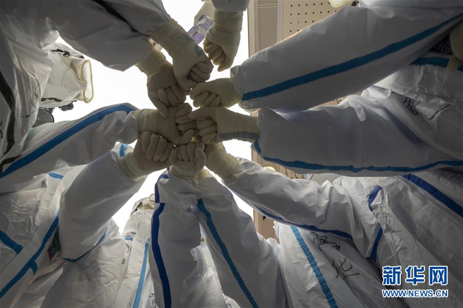 3月10日,在武昌方舱医院,医护人员等待出舱时互相鼓劲。 当日,武昌方舱医院最后一批痊愈病人共49人出舱。 新华社记者 费茂华 摄