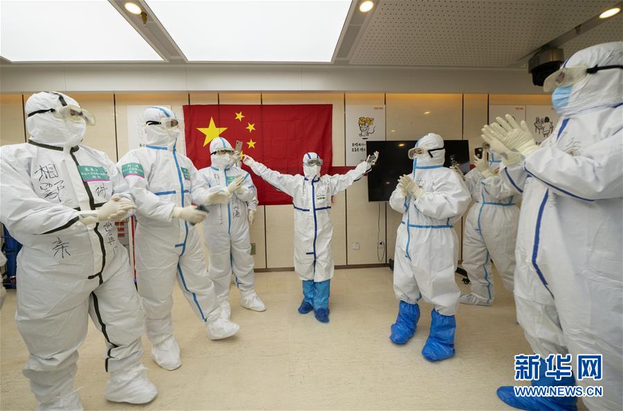 3月10日,在武昌方舱医院,医护人员唱歌庆祝休舱。 当日,武昌方舱医院最后一批痊愈病人共49人出舱。 新华社记者 费茂华 摄