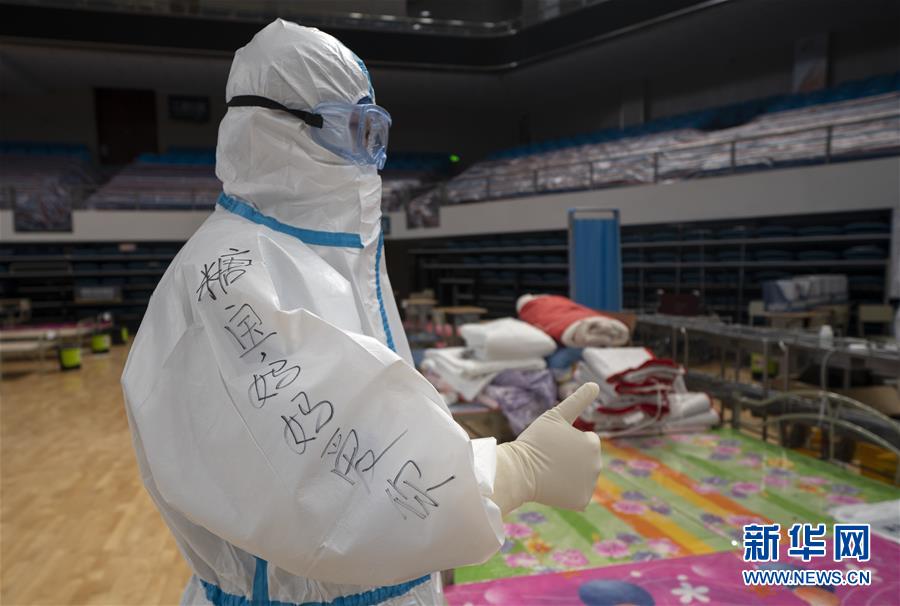 3月10日,在武昌方舱医院,河北医疗队队员韩尚伟等待出舱时展示防护服上写给自己孩子的话。 当日,武昌方舱医院最后一批痊愈病人共49人出舱。 新华社记者 费茂华 摄