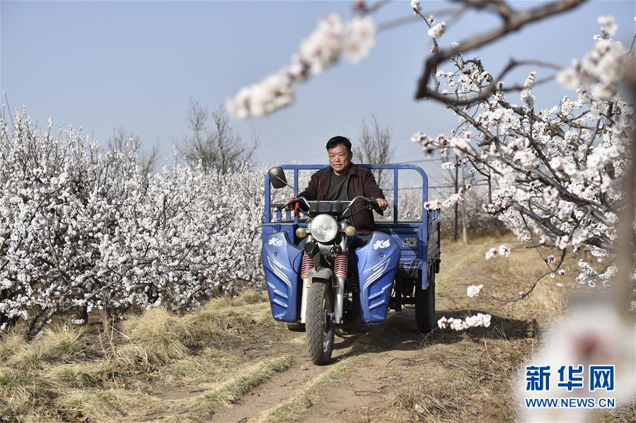 3月10日,东郭镇上月村村民开着农用三轮车行驶在杏树林里。 近日,山西省运城市盐湖区东郭镇的杏花盛开,当地村民抢抓农时,进行果树管护,为丰收打下基础。 新华社记者 徐伟 摄