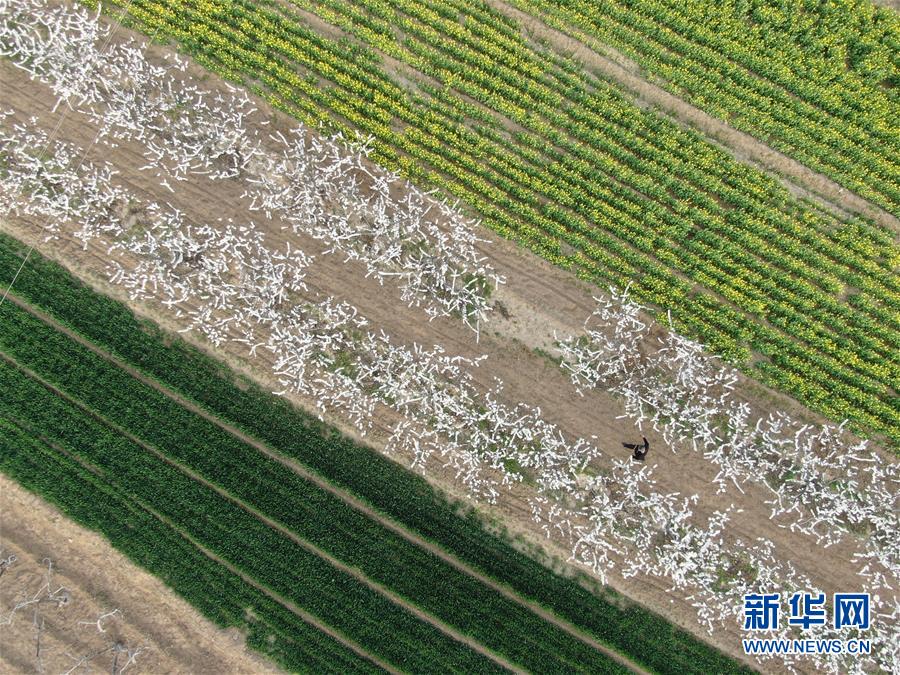3月10日,东郭镇上月村村民在管护杏树林(无人机照片)。 近日,山西省运城市盐湖区东郭镇的杏花盛开,当地村民抢抓农时,进行果树管护,为丰收打下基础。 新华社记者 徐伟 摄